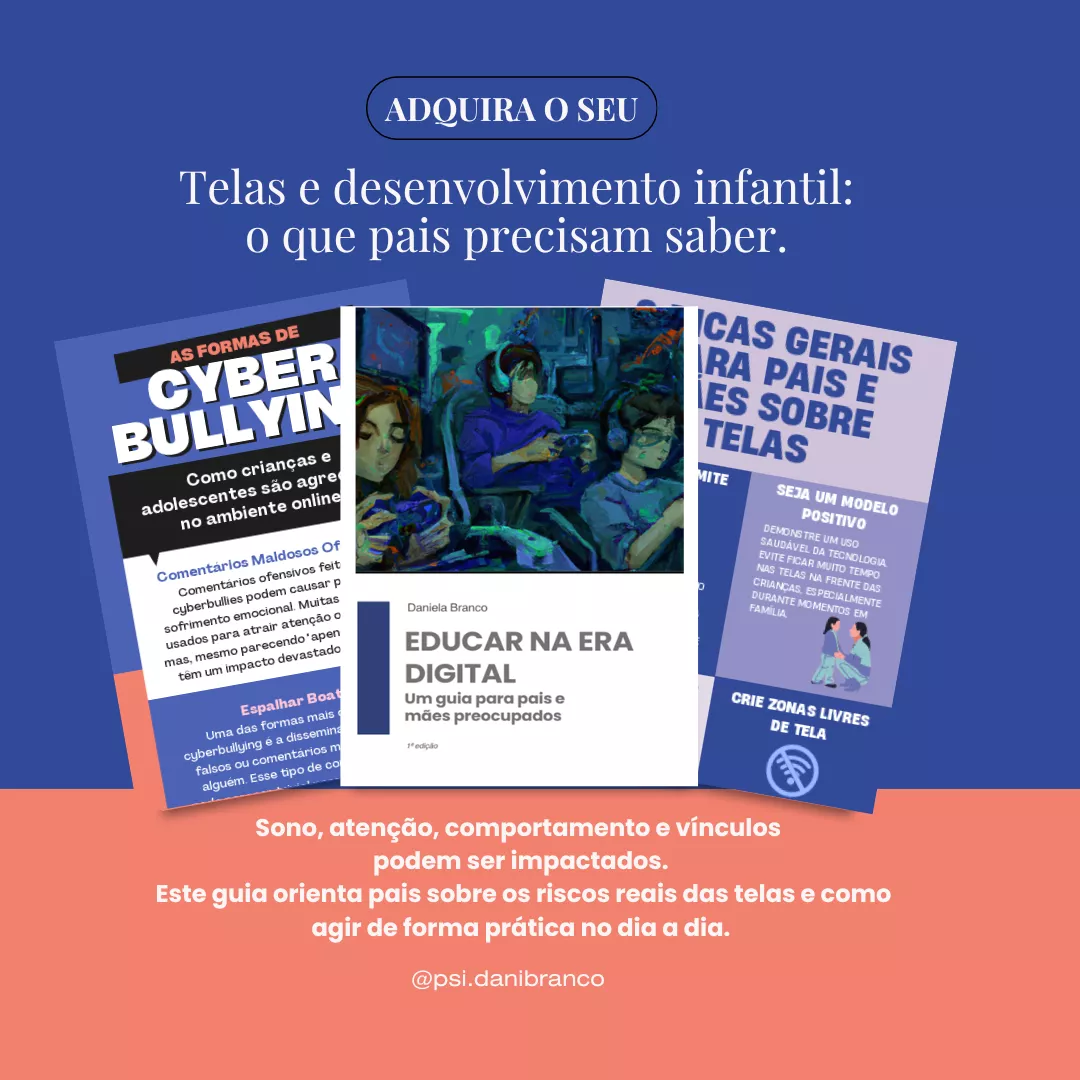 O eBook Educar na Era Digital é um guia criado a partir da escuta clínica e de pesquisas recentes para ajudar pais e mães a compreender o impacto real das telas no desenvolvimento emocional e relacional dos filhos.